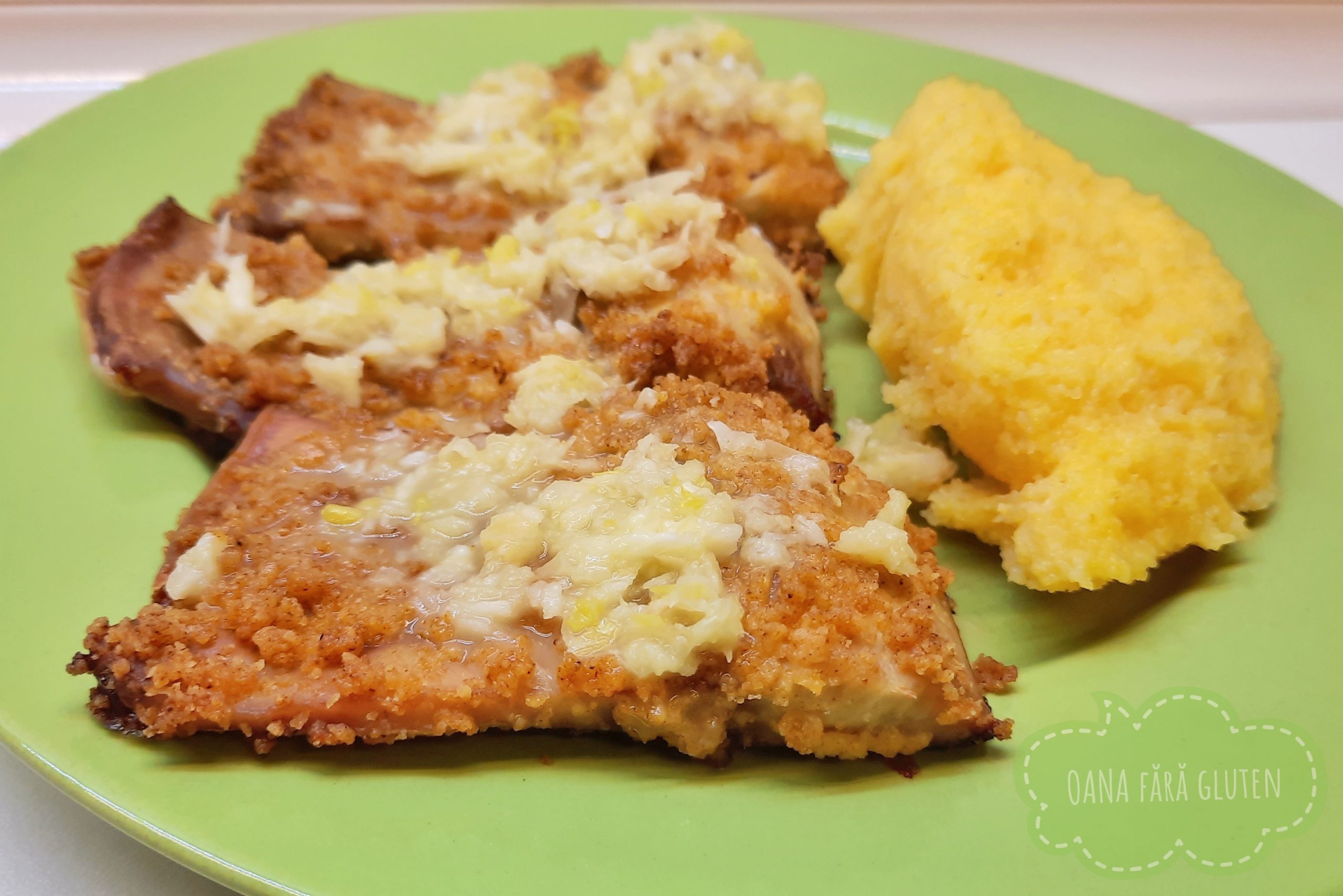 I got 500 grams of wild carp fillets, with a beautiful pink salmon-like meat. I washed it, cut it into large pieces, then patted it dry with paper towels. I sprinkled it with a little salt and let it rest for a bit. I had some well-dried bread on the radiator that I ground up until it was a coarser crumb. I mixed it with salt, chili and rosemary powder, then added olive oil, turning everything into a thick paste. I spread a thin layer of mustard on each piece of fish with the help of a silicone brush, then carefully rolled it in that paste so that it gets an even crust, not too thick. I placed the pieces on baking paper, then with my fingers I lightly dabbed them so that the crust adheres better. I put the tray in the oven preheated to 175 degrees Celsius and left for 35 minutes. Something amazing came out! I’ll never make fried fish again. It doesn’t smell, it doesn’t splatter the stove, it’s not oily, and the taste is amazing, with a crispy crumb crust and a soft meat core. It went great with garlic sauce and warm polenta.